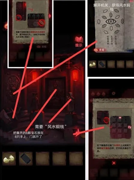 1、解开机关可以获得风水铜钱,我们集齐6个宝石,放在6只手上就打开门。