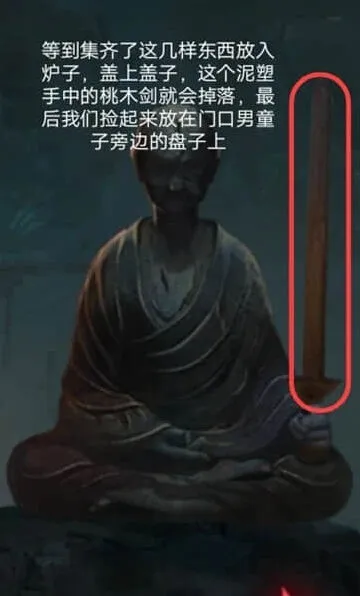 7、我们找齐所有的材料后,把所有材料放进炉子党总,盖上盖子,泥塑手上的桃木剑就会掉落,我们可以把他捡起来,交给门口男童的盘子上。