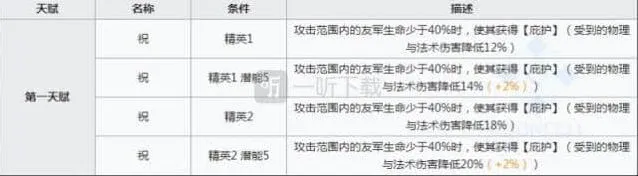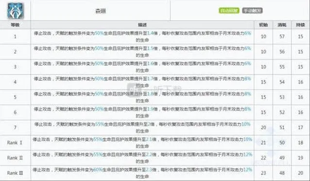 月禾的天赋是自身攻击范围内的友军在生命值低于一定水平线时会获取减伤效果,单纯来论这个天赋,怎么说呢,大家想想就知道,如果高台位都已经掉血到那种程度了,其实也就处在暴毙的边缘,区区20减伤该死还是要死,所以其实很大程度上还是对地面干员更为有效。月禾的天赋效果也是很平常,因为是一位五星干员,所以想要高潜能等级也是不容易的,因此大家是不需要为了潜能强抽。