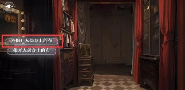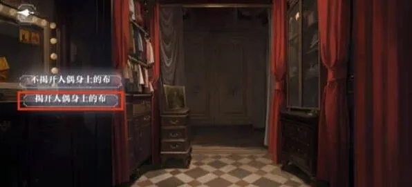 1、房间一、二不变,在房间三调查线索,选择揭开人偶身上的布。