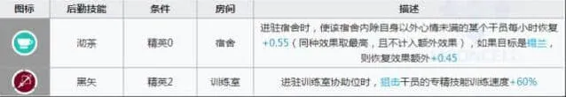 黑的基建技能,怎么说呢,1技能没什么用,因为不缺宿管的,2技能应用率也是一般,也就是训练狙击干员加速,秉承了高星干员基建技能的传统,鸡肋…