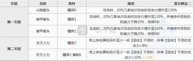 黑的天赋1是技能的基础,虽然单看天赋,概率很低,但是加上技能的话就很可观了,也是因为这个天赋的原因,黑面对什么敌人都基本不会抛光,可以为我们带来很稳定的高伤害,可以说单论输出方面,黑的输出是真的高。而第二天赋的话,也是很实用的了,只要我们队伍里的狙击干员够多,那么效果就会很明显,尤其是能天使,本身攻速已经够快了,那么增加攻击力是非常的实用。