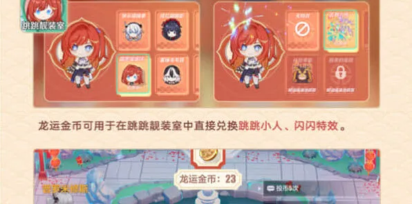 完成新春聊天室2024面板活动任务或年货上交次数达到上限之后前往符华处使用年货兑换,可获得龙运金币。龙运金币可用于在跳跳靓装室中直接兑换跳跳小人、闪闪特效。舰长也可以在好运连连池中投入龙运金币,可随机获得星石、跳跳小人、闪闪特效等奖励。