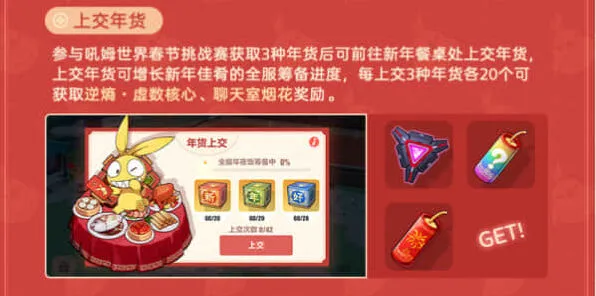 上交年货:参与吼姆世界春节挑战赛获取3种年货后可前往新年餐桌处上交年货,上交年货可增长新年佳肴的全服筹备进度,每上交3种年货各20个可获取逆嫡·虚数核心、聊天室烟花奖励。