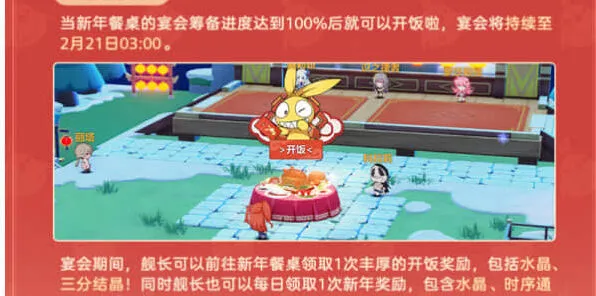 新春宴会:当新年餐桌的宴会筹备进度达到100%后就可以开饭啦,宴会将持续至2月21日03:00。宴会期间舰长可以前往新年餐桌领取1次丰厚的开饭奖励,包括水晶、三分结晶!同时舰长也可以每日领取1次新年奖励,包含水晶、时序通行证奖励~