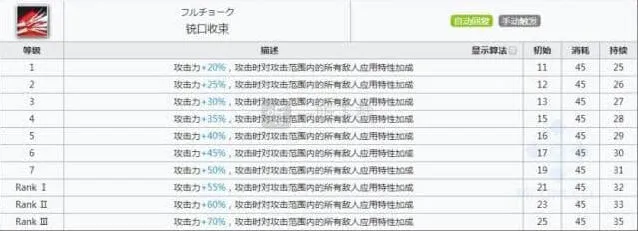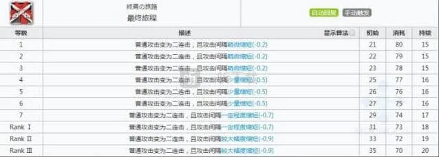 送葬人的1技能和其他很多干员的1技能不一样,在2技能面前也是有着不少的上场空间的,因为1技能的加攻可以赋予送葬人处理高甲敌人的能力,而2技能的话其实面对高甲敌人时依然会抛光的。而且1技能在攻击较远处的敌人时也会适用送葬人特性的加攻了,实战输出效果其实不错的,但是冷却时间是略微有点偏长。这个技能的成长偏平滑,没有质变的等级,所以一般情况下7级倒是也可以解决大多数的情况了。
