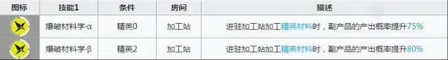陨星的基建技能还算不错,毕竟是80%的副产品概率,在加工站还是不错的,不像很多其他干员,基建是纯粹的冷板凳,陨星还是经常有上班的机会的。