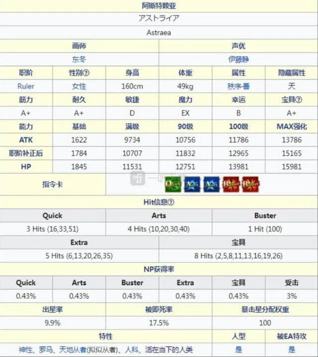 自带对恶属性特攻的宝具本身就赋予了阿斯特莱亚作为一个特攻手的可能,而且恶属性的覆盖范围也并不算小,但是最大的亮点还在于宝具自带的大量获得暴击星,可以说是非常实用了,解决了蓝卡队比较难以获取暴击星的问题。而且阿斯特赖亚的宝具hit数不低,配合自己的蓝魔放和黄金律,进入蓝卡队体系后的宝具np回收也是非常的不错。