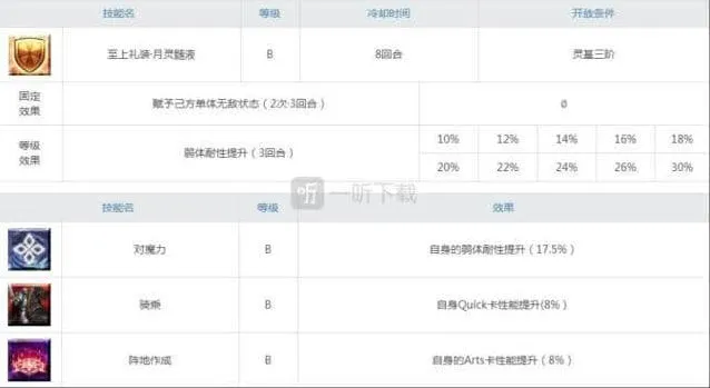 3.技能和宝具综合有加防,降暴,抵消职阶相性不利和次数无敌效果,有着很强的保护能力,可显著提升全队的生存能力。