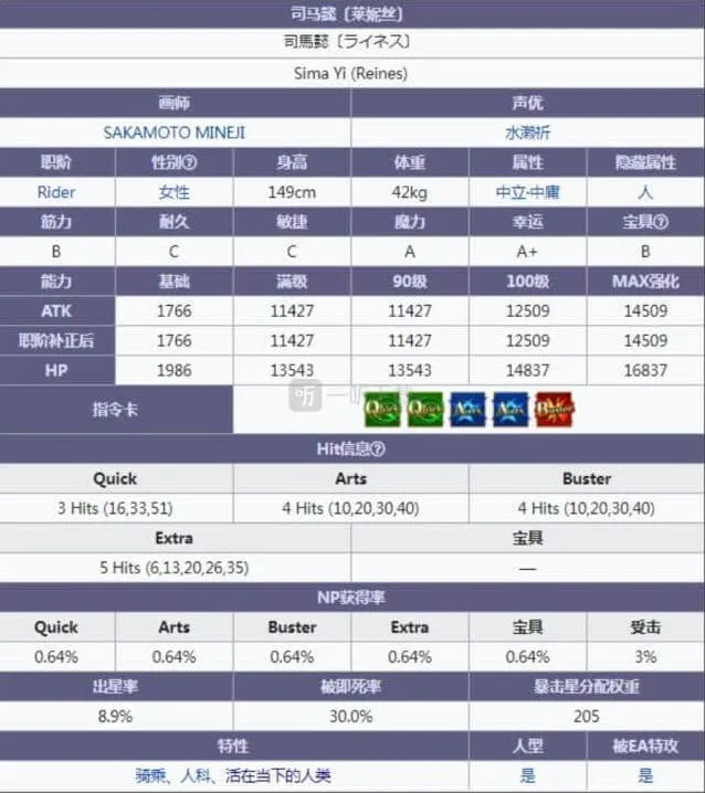 我们从基础的面板来看的话,莱妮丝的面板很明显是很合格的了,atk和hp数值都并不太低,而且np率堪称优秀,蓝卡的np水平处于一流,蓝卡手打np会很舒服,但是相对的,莱妮丝的绿卡就偏差了,虽然有3hit,打星效果尚可,但是np获取能力就有些偏低了,而司马懿的配卡中国绿卡又有2张,还是会对手感造成一定的影响的。