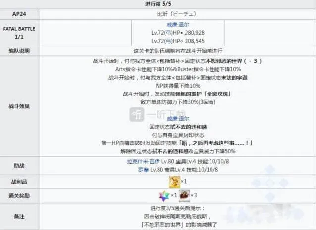 之后的威廉退尔关卡的话,难点在于高达整整30次的概率回避,虽然是概率的,但是几率高达50%,属实有点恶心,如果大家没有处理回避的方法的话可就要做好长久战的准备了,这里推荐大家使用必中或者是无敌贯通礼装,或者是自带无敌贯通必中的从者也可以,不然脸不好的话那是真的恶心。本节此后与威廉退尔的战斗倒是没那么难。