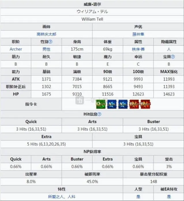 那么我们可以看到,新的三星从者威廉退尔算是比较偏向于针对频繁回避的敌人的特攻对策卡与蓝卡暴击手,在三星从者中其实算是有着很大的亮点和不错的强度的,算是一个合格的新三星从者,但是整体上来看威廉退尔依然没有超越星级的限制,并不属于大英雄这样的极度破格的低星从者,在泛用性的角度考虑,当然还是推荐大家优先培养金卡从者!