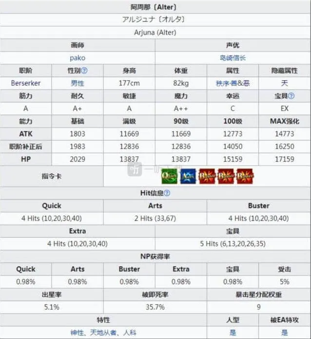 那么我们还是先来看面板吧,从基础面板属性上来看的话,狂阶阿周那alter的攻击力是非常的高了,高额的基础atk白值本身就让阿周那alter有着高伤的基础。至于np率的话,狂阶阿周那的蓝卡只能算是单蓝狂阶从者的正常水平,不算差也不算特别出色,亮点在于绿卡,狂周那的绿卡真的是非常不错,无论是打星还是打np效果都很好,但是因为是三红配卡,所以在实战中发挥也是有限,但是整体来看芭娜娜色卡性能合格,在实战中虽然因为三红配卡,有时候会有点影响手感,但是蓝绿卡的质量还是在线的。