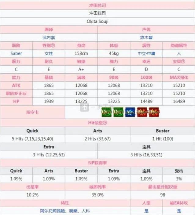 首先我们还是先来分析一下总司的面板吧,从基础面板白值来看的话,总司的攻击力白值在剑阶五星内部还是非常优秀的,仅次于西哥,旧剑和大王,优秀的攻击力白值为总司打下了好基础。而np率的话,这可以说是总司最大的亮点了,在没有任何强化本的情况下,总司还能有所发挥的原因不仅仅是以c师匠为核心的绿卡队,总司本身的np率属于全从者顶级也是原因之一,不论是总司的蓝卡还是绿卡,性能都是非常的棒,蓝卡的np回收非常好,染蓝的绿卡打np也是非常舒服,而且绿卡基本随便就能打出一堆暴击星,可以说优秀的色卡性能基本是目前总司为数不多的核心亮点了,因为在实战中,实际上指令卡的性能是很影响实际的手感的。