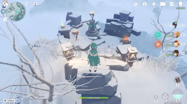 首先,来到雪山山顶的传送点,从这里出发,按照图中的箭头指引的方向前进,来到传送点北方的山顶。