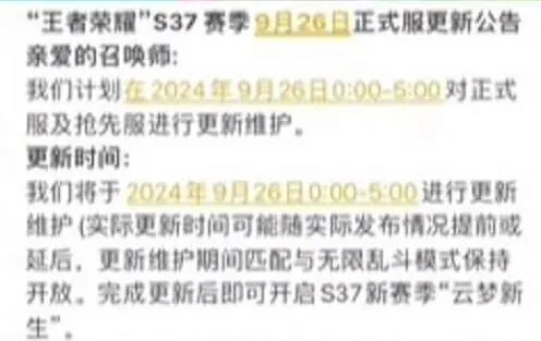 王者荣耀S37赛季的正式更新时间了,网传的提前更新是假消息,游戏还是于9月26号更新的。