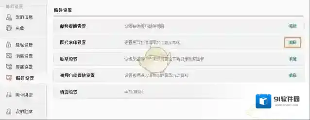 5、在“偏好设置”中,有一个“图片水印位置”项,点击“编辑”。