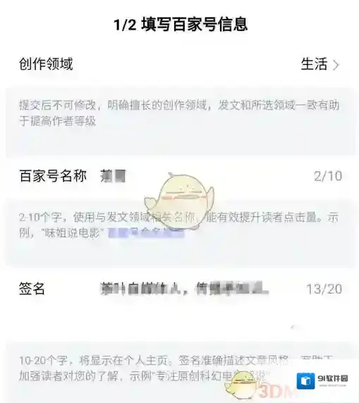 3.填写百家号信息,包含创作领域,百家号名称等。