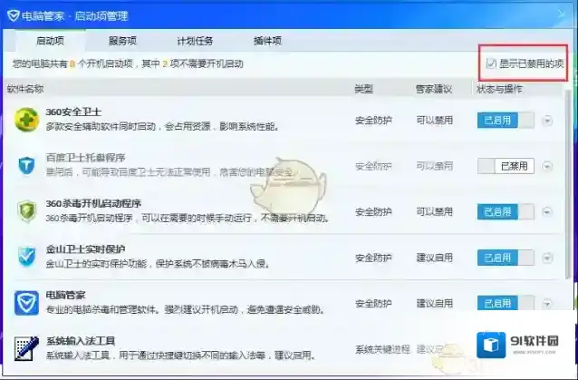 ③勾选“显示已禁用的项”;在软件列表中找到“火萤视频桌面”点击“已禁用”,待状态显示为“已开启”即可设置成功。