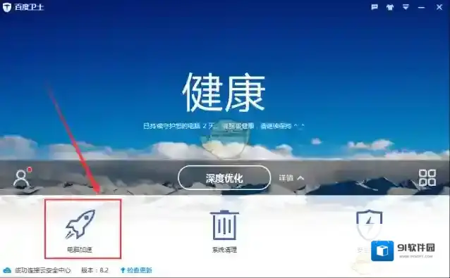 ①打开百度卫士,点击“电脑加速”;