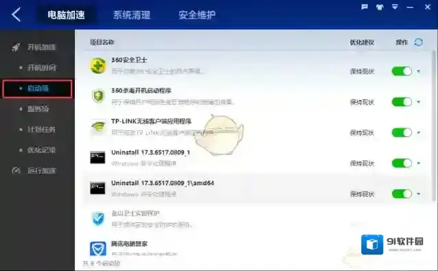 ②依次点击“开机加速”-“开机启动项”,然后在启动项列表中找到“火萤视频桌面”,在最右侧的“状态与操作”中点击“已禁用”,显示为“已开机”即可设置成功。