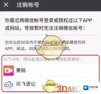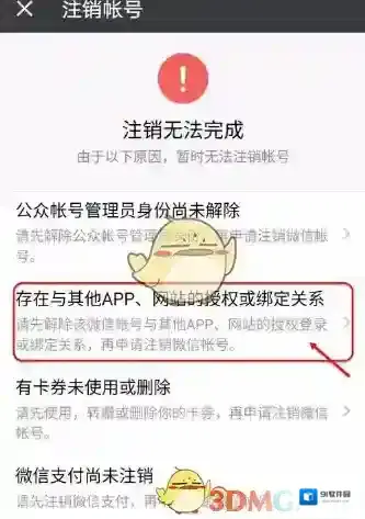弹出“注销无法完成”窗口,点击存在与其他APP,网站授权或绑定关系按钮
