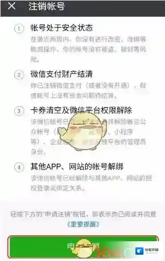 进入注销帐号界面,此处列出了注销帐号要处理的前提条件,也可以点击重要提醒来查看注销帐号带来的严重后果,此处我们并不太关注这些信息,因为我们并不想注销帐号,只要我们微信中绑定了银行卡,微信中还有零钱,此帐号是无法被注销的。