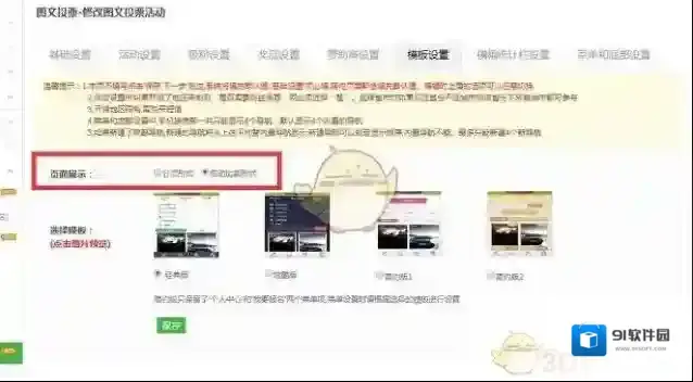 4、吸粉设置,也是可以根据自己的需求进行勾选,投票后抽奖这一项,需要先在微活动里添加好对应的抽奖功能,再进行这里选择即可,下面是奖品设置,赞助商设置,模版设置,页面展示有两种,一个是分页形式,就是有页数的,第二个是自动加载形式,选择模板,一共四个,选中其中一个即可,最后是横幅统计栏设置,上传横幅,自定义设置保存即可。