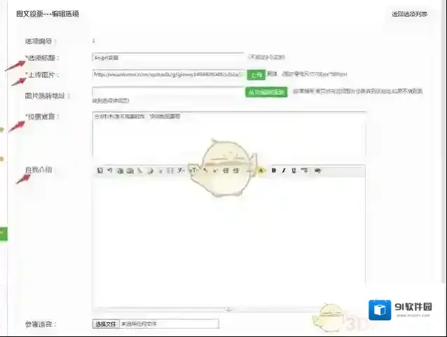 5、完整的编辑好之后,添加报名管理,投票选项里,除了粉丝报名参加,也可以在后台上传投票选项。如果不需要报名,就需要在这里添加,打星号的全部完善好,就可以的;报名管理是审核粉丝的报名信息。投票记录可以详细看到粉丝投票的详情。