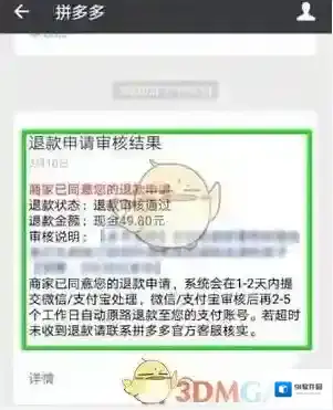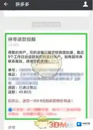 当退款完成后,我们又会收到一个“拼单退款提醒”,退款成功。