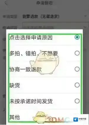 这时会弹出一个原因选择页面,在页面中选中你要进行退货退款的原因。