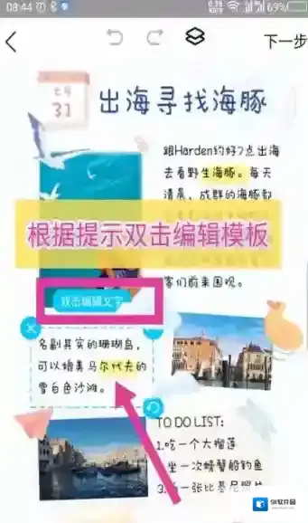 6、在打开的模板界面,点击要修改的内容,根据提示可以双击编辑内容。如图所示