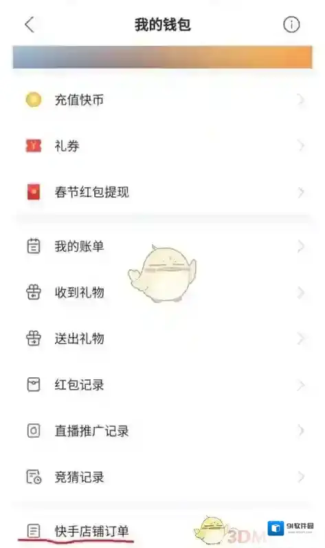 4、在我的钱包页面,往下滑,在最下面一栏找到“快手店铺订单”:
