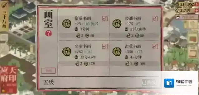 3.将建造的画室等建筑升级为满级五级状态增加铜钱产量,并降低生产时间。
