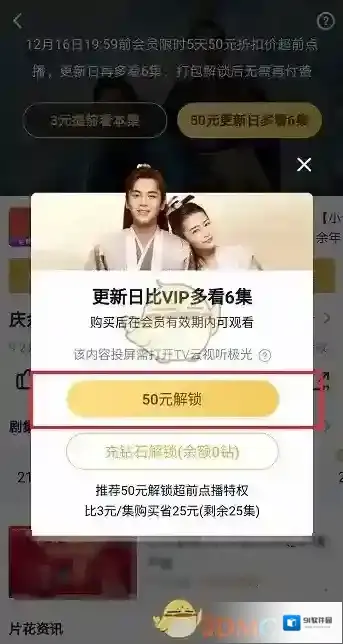 4、也可以通过花费50元,每次更新多看6集。用户可以根据自己的需要使用超前点播,如果不想付费的话,就多等一周就可以了。