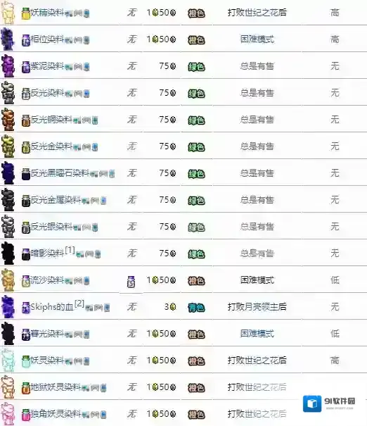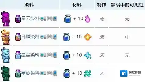 泰拉瑞亚中,染料是用来改变直接外观颜色的道具,有很多玩家不知道有哪些染料,下面就为大家分享泰拉瑞亚全染料大全,感兴趣的玩家不要错过哦!