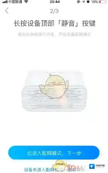 4、根据提示,长按设备顶部的“静音”按钮,直到出现亮灯,然后在手机上点击“已进入配网模式,“下一步”。