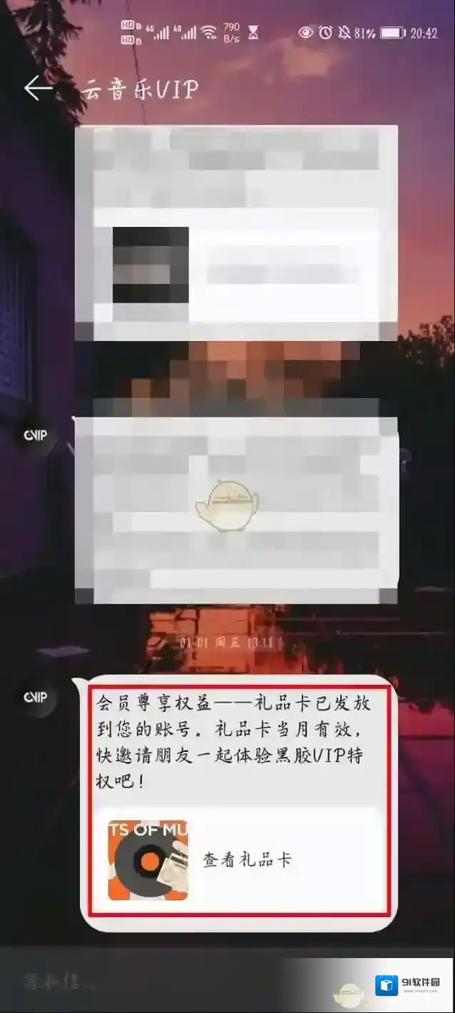 5、可以查看到每月初,对方发过来的会员尊享权益的提示。找到关于礼品卡发放的消息。