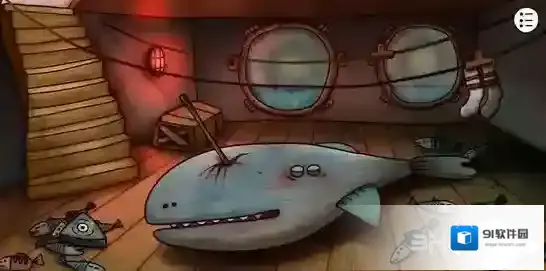 回到码头船舱中,用刀将鲸鱼肚子剖开,得到鱼骨和矛头。