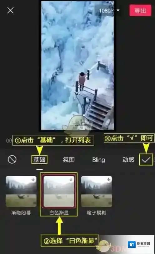 5、选择特效。点击“基础”,打开列表,选择“白色渐显”,点击列表右上角的“√”即可。