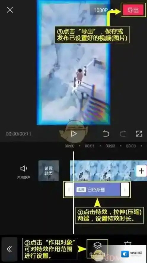 6、设置特效。点击特效,拉伸(压缩)两端,设置特效时长;点击“作用对象”,可对特效作用范围进行设置;点击“导出”,保存或发布已设置好的视频(图片)。