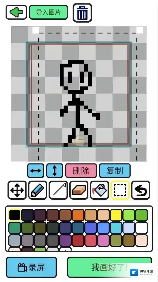 2、所以在设计时首先要想好自己的设计物品的大小,接着使用第一个移动工具放大至某个地方至一个背景格大小(记得画像素画时把笔大小定为最小,因为最小画笔宽度就是一像素)