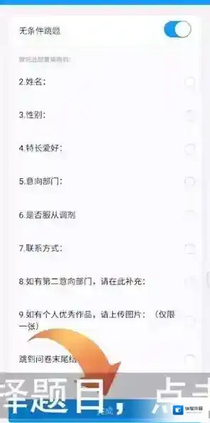 3、点击无条件跳题旁的按钮,再选择题目,点击完成;