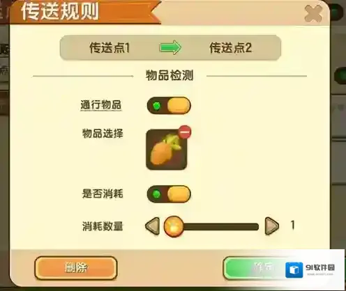 然后我们可以设置通行物品,可以理解成”钥匙“,玩家必须消耗特定个数的一种物品才能使用传送方块。