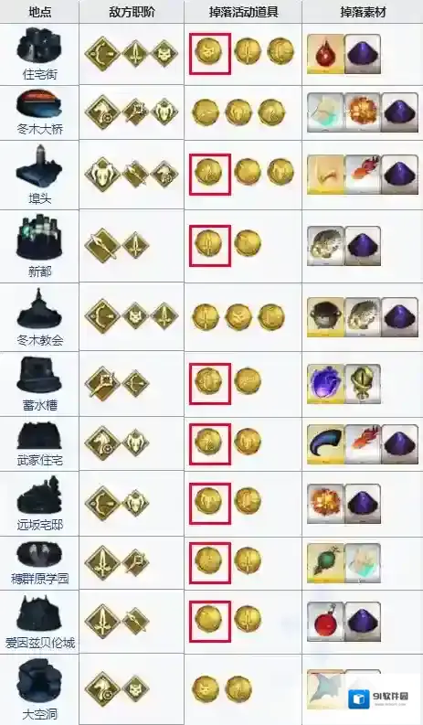 红色框圈起来的是对应素材掉落最高的地点。