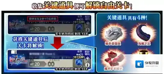 关键道具一共有4种:分别为「暗杀者面具」、「海魔之足」、「魔术矿石碎片」、「至宝之杯」。