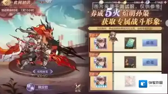 在此间初识模块中,本次活动将会开放「煊明孙策-限定款战斗形象」,并可在该模块中进行试玩,该活动奖励可在「煊明孙策」的觉醒等级培养至目标等级时获取!