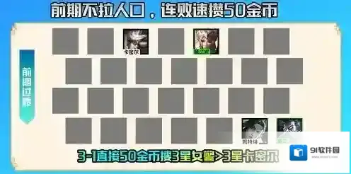11.前期阵容:前期不拉人口,建议走连败运营思路,开局2-1有10金币,2-3有20金币,2-5有30金币,2-6有40金币,2-7有50金币,这样在3-1就能够有60+金币去抽卡了。3-1直接全部搜光追3星女警 卡密尔,当前版本一费卡基本没有人赌,只要运营不是特别背基本都能够追到3星女警。女警一到3星就马上拉人口去找杰斯开出4执法羁绊。