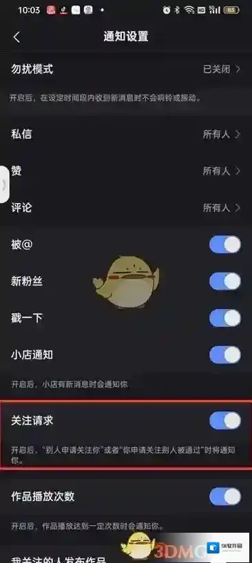 4、然后在通知设置的页面中点击关注请求开启即可。