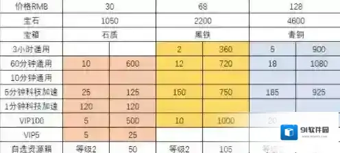 有的礼包中提供的是体力药水加通用加速、有的是训练加速和资源、有的是材料箱子和加速和资源、有的是科技加速和通用加速。